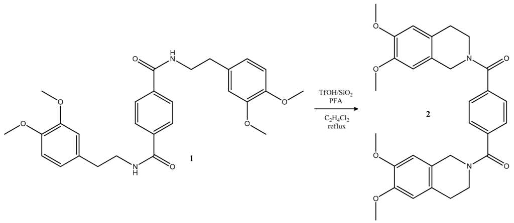 For the cyclization step, to amide 1 (Scheme 1) dissolved in dichloroethane we added paraformaldehyde in excess and TfOH/SiO2. Compound 2 was successfully obtained by refluxing the reaction mixture for 10 min. After completion of the reaction, the reaction mixture was cooled, and the catalyst was removed via filtration. The solvent was then distilled via rotary evaporator.