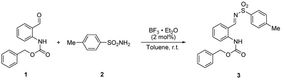 The synthesis of the title compound 3 was achieved in one step, as presented in Scheme 1, which was performed by the condensation reaction of benzyl 2-formylphenylcarbamate (1) [10] with p-toluenesulfonyl amine (2). The reaction was carried out in toluene in the presence of 2 mol% of boron trifluoride diethyl etherate as a catalyst and provided the desired product in good yield. The structure of compound 3 was confirmed by 1H- and 13C-NMR, IR, mass spectral data, and all data are in accordance with the assumed structure.