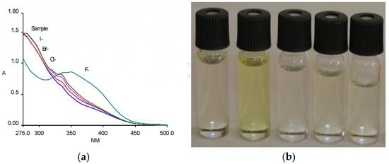 (a) UV-vis absorption changes of compound 3 (0.01 mM) upon addition of tetrabutylammonium salt of halides in DMSO; (b) The color changes of compound (3) in DMSO solution (0.01 mM), from left to right, upon addition of 1 equiv. of tetrabutylammonium ions; free, F−, Cl−, Br− and I−.