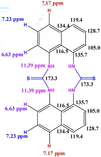 The title compound, 1,3,1′,3′-(dinaphthalene-1,8-diyl)bisthiourea, was synthesized and characterized by elemental analysis, IR and 1H- and 13C-NMR spectroscopic analysis. The FT-IR data of the compound showed two N-H stretching bands at 3411 and 3326 cm−1. The peaks at 3030, 2968 cm−1 and 1508 cm−1 in the IR data were confirmed as the aromatic C-H and C=C stretching bands, respectively. The strong peak at 1599 cm−1 was assigned to the N-H bending band. In addition, the strong band at 1353 cm−1 was confirmed in presence of the amido (=C-N-) stretching vibration. The very intense peak at 768 cm−1 showed C-N asymmetric stretching. The strong bands observed at 1299 and 716 cm−1 were assigned to thioureido N-C=S and C=S stretching vibrations, respectively (Figure S1). In 1H-NMR spectrum, the compound exhibited broad signals at 11.39 ppm (1H, s) which were assigned to the NH-C(S) protons. Generally, the NMR signals of NH protons for thioamides are observed in the range of 9–10 ppm. The chemical shifts of protons on the symmetric naphthalene ring were observed at 7.23 (q, 3,6,3′,6′-positions), 7.17 (dd, 4,5, 4′,5′-positions) and 6.63 (dd, 2,7, 2′,7′-positions) ppm, because the compound consists of two naphthalene units (Figures S2 and S3). In the 13C-NMR signals, chemical shifts for the naphthalene ring carbons were observed at 105(C2), 116(C6), 119(C4), 128(C3), 134(C5) and 135(C1) ppm. The carbon atoms of thiocarbonyl (C=S) in the symmetric thiourea structure appeared at 173 ppm (Figures S4 and S5) (Scheme 2) (see Supplementary Material).