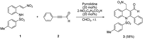 The synthesis of 1,4-dihydro-4-(nitromethyl)-2-phenyl-1-tosylquinoline-3-carbaldehyde (3) was achieved in one step, as presented in Scheme 1, which was performed via an aza-Michael/Michael cascade reaction of 2-((E)-2-nitrovinyl)-N-tosylbenzenamine (1) with 3-phenylpropiolaldehyde (2). The reaction was carried out in toluene in the presence of 20 mol % pyrrolidine as a catalyst and 20 mol % 2-nitrobenzoic acid as an additive. The desired product 3 was obtained in moderate yield via an aza-Michael/Michael cascade reaction. The structure of compound 3 was confirmed via 1H- and 13C-NMR, IR, and mass spectral data, and all data are in accordance with the proposed structure.