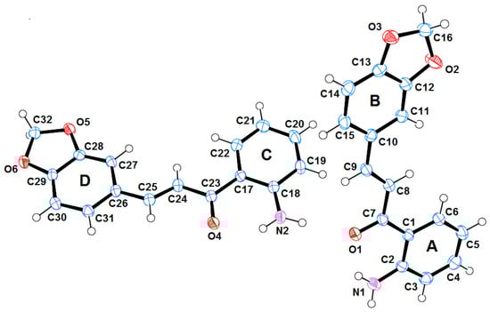 Similar compounds to 3 have previously been reported in the literature (i.e., 1-(6-amino-1,3-benzodioxol-5-yl)-3-(3,4,5-trimethoxyphenyl)prop-2-en-1-one [14] and 1-(6-amino-1,3-benzodioxol-5-yl)-3-(4-methoxyphenyl)prop-2-en-1-one [15]). The title compound 3 crystallizes in triclinic, P, with Z = 4. In the molecular structure of 3 shown in Figure 1, the central fragments C1–C7(O1)–C8=C9–C10 and C17–C23(O2)–C24=C25–C6 are essentially planar (root-mean-square (r.m.s.) deviation for all non-H atoms = 0.0210 Å and 0.0493 Å respectively) and they form dihedral angles of 1.47(9)° and 7.79(15)° with the A and C aryl rings, respectively and 4.86(9)° and 2.09(15)° with the B and D benzodioxol rings, respectively. The amino groups are syn positioned with respect to the carbonyl groups in both molecules.