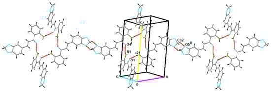 The packing arrangement of the title compound can be described by strong intramolecular N–H...O hydrogen bonds and by intermolecular N–H...O and C–H...O hydrogen bonds of medium-strength (see Table 1), [16]. The two molecules of the asymmetric unit intertwine to form intra-intermolecular intercalated bonds, generating S(6) and (24) rings [17]. In these interactions, the N2–H3N moiety in the molecule at (x,y,z) acts as a hydrogen-bond donor to the O1 atom of the carbonyl group at (x,y,z) and N1–H1N in the molecule at (x,y,z) acts as a hydrogen-bond donor to the O4 atom of the carbonyl group at (2 − x, 1 − y, 1 − z). Molecules are connected and they are related by an inversion center, forming a kind of inner ring as seen in Figure 2. One of the molecules of the asymmetric unit proceeds to join, via C32–H32...O5 bonds with its twin molecule, configuring dimers with -(6) rings. Thus, the inner rings are attached to C(18) chains of molecules, forming sheets running parallel to (110).
