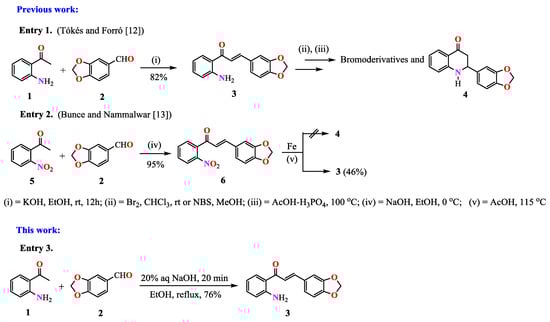 Chalcone 3 was previously prepared in 82% yield (m.p. 112 °C) by Tókés and Forró [12] for diverse bromination studies involving the formation of the tetrahydroquinolone 4, (Entry 1, Scheme 1). Posteriorly, Bunce and Nammalwar [13] obtained chalcone 3 as a side-product in 46% yield (m.p. 110–112 °C), attempting to synthesize the quinolone 4 through an in situ tandem reduction–Michael addition reaction in acetic acid media, (Entry 2, Scheme 1).