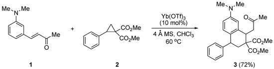 The synthesis of dimethyl 7-(dimethylamino)-3,4-dihydro-1-(2-oxopropyl)-4-phenylnaphthal-ene-2,2(1H)-dicarboxylate (3) was achieved in one step, as presented in Scheme 1, which was performed by a Friedel-Crafts–type ring-opening/intramolecular Michael addition cascade reaction of (E)-4-(3-(dimethylamino)phenyl)but-3-en-2-one (1) [10] with dimethyl 2-phenylcycloprop-ane-1,1-dicarboxylate (2) [11]. The reaction was carried out in CHCl3 in the presence of 10 mol % of Yb(OTf)3 as a catalyst and 4 Å molecular sieve as an additive at 60 °C. The desired product 3 was obtained in 72% yield with moderate diastereoselectivity (7:3 dr) via the ring-opening/Michael cascade reaction. The structure of compound 3 was confirmed by 1H- and 13C-NMR, IR, mass spectral data, and all data are in accordance with the proposed structure.
