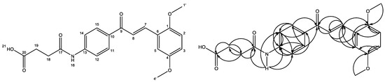 (E)-4-((3-(3-(2,5-Dimethoxyphenyl)acryloyl)phenyl)amino)-4-oxobutanoic acid (2): orange solid (266 mg; 75%), m.p. 188–190 °C, Rf = 0.61 (ethanol), HR-MS [M + H]+ calculated for C21H21NO6 384.1447, found 384.1446; IR (KBr, cm−1) 3448 (br, -OH carboxylic), 3340 (str, -NH- amide), 1720 (str, C=O aliphatic carboxylic acid), 1697 (str, C=O amide), 1639 (C=O conjugated), 1593 (str, C=C conjugated), and 1261 (Calkyl-O-Caryl); 1H-NMR (400 MHz, DMSO-d6) δ (ppm) 12.15 (s, 1H), 10.32 (s, 1H), 8.10 (d, J = 8.7 Hz, 2H), 7.97 (d, J = 15.7 Hz, 1H), 7.86 (d, J = 15.7 Hz, 1H), 7.73 (d, J = 8.7 Hz, 2H), 7.51 (d, J = 2.3 Hz, 1H), 7.08–6.92 (m, 2H), 3.80 (s, 3H), 3.76 (s, 3H), 2.58 (t, J = 6.2 Hz, 2H), 2.50 (t, J = 6.0 Hz, 2H). 13C-NMR (101 MHz, DMSO-d6) δ (ppm) 188.05, 174.33, 171.35, 153.77, 153.16, 144.19, 138.06, 132.64, 130.46, 124.08, 122.36, 118.73, 118.57, 113.53, 112.93, 56.66, 56.22, 31.71, 29.13.
