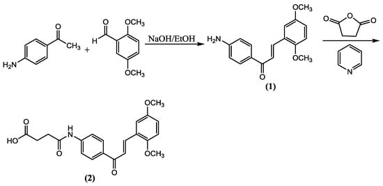 The title compound was synthesized in a two-step reaction. The first step was the synthesis of a methoxy amino chalcone (1) employing the Claisen-Schmidt reaction, then followed by the amidation of (1) through the reaction of (1) with succinic anhydride in ethanol using pyridine as a catalyst, as shown in Scheme 1.