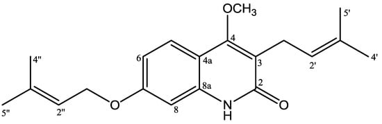 Structures of 4-methoxy-3-(3-methylbut-2-en-1-yl)-7-[(3-methylbut-2-en-1-yl)oxy]quinolin-2(1H)-one.