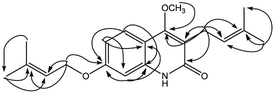 On the basis of above spectral evidence, the structure of 1 was elucidated as 4-methoxy-3-(3-methylbut-2-en-1-yl)-7-[(3-methylbut-2-en-1-yl)oxy]quinolin-2(1H)-one. Other HMBC correlations consistent with structure 1 are shown in Table 1 and Figure 2. The structure of 1 has not been previously reported, and it is a novel compound. On cytotoxic evaluation against P-388 cells, compound 1 exhibited IC50 values of 0.63 μg/mL. That cytotoxic data suggested that compound 1 has high activity. The antiplasmodial activity of 1 showed IC50 values of 4.28 μg/mL, which categorized as moderate activity. The data on cytotoxic and antiplasmodial activity are presented in Table 2.
