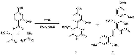 The mixture of 2,4-dimethoxybenzaldehyde (5 mmol), ethyl acetoacetate (3 mmol), urea (5 mmol), PTSA (1 mmol), and 3 mL ethanol was refluxed in a round bottom flask. The progress of the reaction was monitored by TLC. After 6 h, the reaction mixture was cooled down to room temperature, and precipitated by the addition of water. The orange precipitate (mixture of compounds 1 and 2) was then filtered off, dried, and then subjected to a silica gel 60 G column chromatography using a mixture of chloroform:ethyl acetate (3:1) as mobile phase.