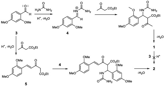 The usage of the catalyst PTSA for the Biginelli reaction has often been reported. This catalyst can be used under various reaction conditions, such as reflux in ethanol [13], grindstone [14], microwave [15] and ultrasonic irradiation [16]. However, these reaction conditions give only the main product, and do not provide side products such as compound 2. Seemingly, the amount of catalyst used has an effect on the formation of side products. The reaction condition mentioned used PTSA in a relatively low amount (<15%). In contrast with our experiment based on ethyl acetoacetate, we used 33 mol% of the catalyst. The reaction between compound 1 and 2,4-dimethoxybenzaldehyde using 33% PTSA as catalyst gave no product. This observation led to the argument that compound 2 was formed through a one-step multicomponent reaction, competing with the formation reaction of compound 1. Therefore, we propose a reaction pathway which starts with an aldol condensation between ethyl acetoacetate and 2,4-dimethoxybenzaldehyde to produce intermediate 5, which is a γ,δ-unsaturated dicarbonyl compound. A subsequent Biginelli reaction then generates compound 2 (see Figure 2).