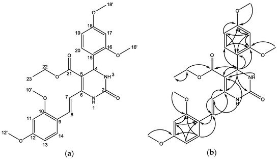 Based on the results of the HMQC experiment, we observed two protons forming no correlation with carbon atoms, namely singlet proton signal at δH at 6.83 and 5.67 ppm. This indicated that both protons were attached to a heteroatom, namely nitrogen. Furthermore, it was observed that a proton at δH 5.73 ppm attached to a carbon atom at δH 50.0 ppm (see Supplementary Materials, Figure S6). This showed that the proton is a benzylic-allylic attached to nitrogen, which is characteristic for 3,4-dihydropyrimidinone with aryl substituent at C-4. In addition, the existence of the 3,4-dihydropyrimidinone scaffold was also supported by the results of the HMBC experiment, which showed a correlation between the proton at C-4 with conjugated olefinic carbon (δC 99 ppm (C-5) and 145.2 ppm (C-6) the and urea carbonyl type (δC 153.1, C-2). The presence of the aryl group at C-4 is proved by a long-range correlation of the C-4 proton with three aromatic protons [δC 122.4 (C-15), 157.9 (C-16), and 127.5 (C-20)]. Long-range correlation of the C-4 proton with the carbon atom δC 165.8 ppm indicated that the conjugated carbonyl ester was attached to C-5. The position of styryl moiety at C-6 is proved by the long-range correlation of proton H-1 (δH 6.83 ppm) with olefinic carbon (δC 117.4. C-7). In addition, both olefinic protons [7.30 (H-7) and 8.09 (H-8)] built long-range correlations with C-6. The long-range correlations of the HMBC experiment that are possible with the structure of compound 2 are displayed in Figure 3 and in Figure S7 in the Supplementary Materials. Based on the structure elucidation, it can be concluded that compound 2 is a new compound, and it has not been previously identified in the literature.