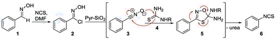 In a recent research project [], we reported on a flow-based transformation of chloro-oximes (2) to isothiocyanates (6) via the intermediacy of a nitrile oxide dipole (3) that underwent a [3 + 2]-cycloaddition with a thiourea species (4). As indicated in Scheme 1, a skeletal rearrangement of the initial cycloadduct 5 subsequently rendered the desired isothiocyanate product 6.