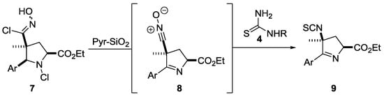 During this study, we also subjected some more elaborate substrates, such as substituted pyrrolidines [], to this sequence and were pleased to obtain the expected isothiocyanate. However, we also observed the simultaneous generation of a cyclic imine functionality, which indicated that chlorination had not only occurred on the oxime to yield a chloro-oxime, but also on the pyrrolidine nitrogen (7, Scheme 2). Upon treatment of this dichlorinated material (7) with silica-supported pyridine (Pyr-SiO2, 2.5 equiv.) both the highly reactive nitrile oxide and the more stable oxime were generated, subsequently leading to the corresponding isothiocyanate product 9. Importantly, this procedure worked equally well for diastereopure samples, as well as mixtures of diastereomers at the quaternary carbon.