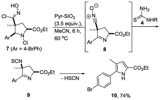 A solution of the dichloride 7 (Ar = 4-BrPh) was freshly prepared by adding N-chlorosuccinimide (NCS, 1.1 mmol, 147 mg, 2.2 equiv.) to a solution of the corresponding oxime (1.0 mmol, 175 mg, d.r. 2:1) in DMF (2 mL). After stirring this mixture for 4 h at ambient temperature, diethyl ether (10 mL) and water (10 mL) were added and the mixture was extracted into diethyl ether. The organic layer was dried over anhydrous sodium sulfate, filtered, and evaporated to dryness to yield the crude dichloride intermediate as a colorless oil. This material was redissolved in MeCN (6 mL) and combined with silica-supported pyridine (2.45 g, 3.5 equiv., []) and an immobilized thiourea (QP-SA, 500 mg, 2.0 mmol, 4.0 equiv., []). After heating the resulting mixture at 60 °C for 6 h, complete conversion of substrate was observed by TLC. Filtration and evaporation yielded a yellow oil that was further purified by silica column chromatography (10–20% EtOAc/hexanes) to furnish pyrrole 10 as a colorless solid, which was recrystallized from DCM/toluene giving the desired product as colorless crystals (74%, 114 mg). Please see SI for further information.