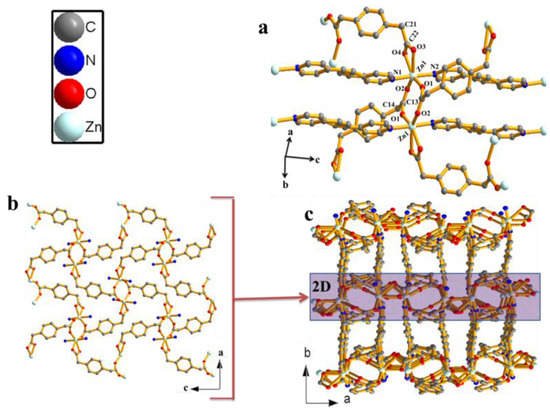 In recent times, metal–organic framework (MOF) materials have received a great deal of attention not only for their unique properties, but also for their potential applications owing to their diversity in topological architectures [1,2,3,4]. Metal–organic frameworks consist of a metal ion linked by organic ligands to form one-, two-, or three-dimensional network structures [5,6]. A number of carboxylate ligands with aromatic backbones are frequently used in the design of metal–organic frameworks with desirable properties. Versatile carboxylate ligands derived from 1,4-benzenedicarboxylic acid, 1,3,5-benzenetricarboxylic acid, 1,2,4,5-benzenetetracarboxylic acid, or pyridine-2,4-dicarboxylic acid are commonly used owing to their abundant carboxylate groups possessing high affinity to metal cations [7,8,9]. Other functionalized ligands such as 1,2-bis(4-pyridyl)ethylene, 1,4-benzenediacetic acid, 4,4′-bipyridylethene, or 3-nitro-1,2-benzenedicarboxlic acid have also been extensively used under diverse synthetic conditions to prepare MOFs [10,11,12,13,14,15,16,17], which are used in several applications [18,19,20,21,22]. The interest in the use of phenylenediacetic acid as ligand in the synthesis of coordination polymers stems from the presence of the flexible −CH2 spacer that enables the −CO2 units to freely bend and rotate to meet the requirements of the coordination geometries of metal ions in the assembly process [23]. Researchers have made used of the flexible nature of phenylenediacetate along with different auxiliary ligands in preparing one-, two-, and three-dimensional structures [24,25,26,27,28]. In particular, Wang and coworkers [24,25] investigated a synthetic system containing various divalent metal acetates, 1,2-phenylenediacetate and 1,3-bis(4-pyridyl)propane co-ligand. Zhang et al. [23] reported on the structural diversities of divalent metal complexes of 1,3-phenylenediacetate with organo-nitrogen co-ligands, in which the structural characteristics of auxiliary ligands vary from chelating to bridging. However, reports on the coordination polymers of 1,4-phenylenediacetate are scant [26,27]. In this study, we were interested in using one long chain linkers 4,4-bipyridylethylene (bpee) with −CH=CH− (ethylenic) functionalities as N-donors and 1,4-benzenediacetic acid (bda) to synthesize a coordination polymer. We have been able to prepare a zinc(II)-coordination polymer, C22H18ZnN2O4, 1, with a three-dimensional structure, incorporating the two ligands, via solvent diffusion technique.