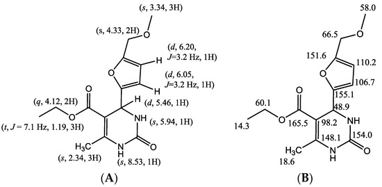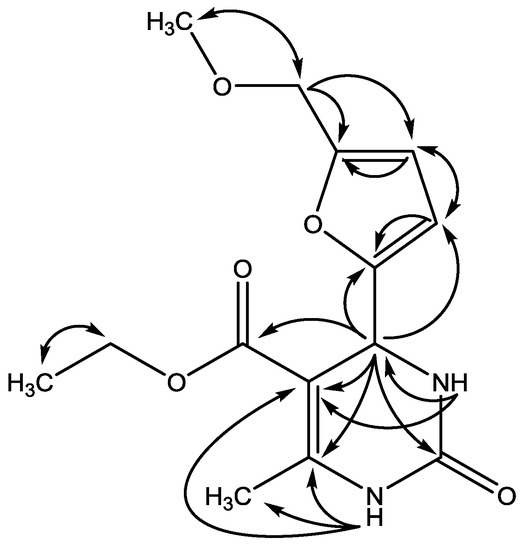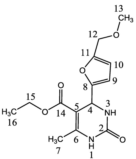 The existence of two NH protons was also confirmed by HMQC experiment which showed the existence of two proton signals exhibiting no correlation with carbon atoms (see Supplementary Material, Figure S5). Based on HMBC experiment (see Supplementary Material, Figure S6), the presence of 6-methyl-4-aryl-3,4-dihydropyrimidin-2-one scaffold possessing ester substituent at C-5 was convinced by a correlation of proton H-4 (δH 5.46 ppm) with olefinic carbon and α,β-unsaturated carbonyl ester δC (ppm) 98.2 (C-5), 148.1 (C-6), 165.5 (C-14) respectively, carbonyl urea-type (δC 154.0 ppm, C-2), and two carbon from the furan ring—δC (ppm) 155.1 (C-8) and 106.7 (C-9). The presence of this skeleton was also convinced by a long range correlation of NH proton δH 8.53 ppm (H-1) with two α,β-unsaturated olefinic carbon atoms (C-5 and C-6) and methyl olefinic (δC 18.6 ppm, C-7). Furthermore, the presence of furan ring was convinced by two aromatic protons—δH (ppm) 6.05 (H-9) and 6.20 (H-10)—which correlated with its three neighboring carbon atoms—δC (ppm) 155.1 (C-8), 151.6 (C-11), and 110.2 (C-10) or 106.7 (C-9). In addition, the presence of methoxymethylene substituent at C-11 was convinced by a long range correlation between methylene proton δH 4.33 with two carbon of furan ring (C-10 and C-11) and methoxy carbon (δC 58 ppm, C-13). The selected long range correlation is suitable with the structure of the title compound is displayed in Figure 3. The structure refinement parameters is displayed in Table 1. Based on the structure elucidation of the obtained spectrum, the title compound is a new compound.