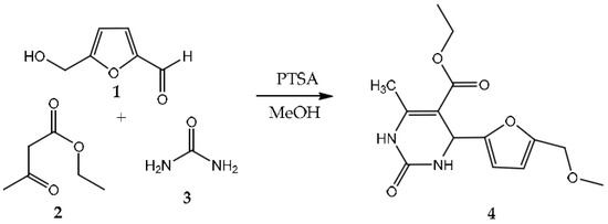 Synthesis of ethyl 4-[5-(methoxymethyl)furan-2-yl]-6-methyl-2-oxo-1,2,3,4-tetrahydro pyrimidine-5-carboxylate (4).