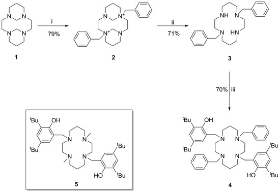 The synthetic strategy for the synthesis of the title compound 4, is shown in Scheme 1. In order to control the nucleophilicity of the nitrogen atoms of cyclam, methylene bridges were introduced to rigidify the macrocyclic backbone, to give compound 1 [21]. The use of formaldehyde in this instance was preferred over glyoxal to yield the more reactive diammonium salt. Consequently, rigidifying the backbone resulted in only two of the four nitrogen atoms possessing exo lone pairs for nucleophilic attack of benzyl bromide. Thus, the isolation of compound 2 was facile, and was produced in an almost quantitative yield. Subsequent removal of the methylene bridges in basic media gave compound 3, analytical data for which matched existing literature data [21,22]. Subsequent N-alkylation with 2-hydroxy-3,5-di-tert-butylbenzyl was facilitated via an established Mannich procedure [14] by using formaldehyde and 2,4-di-tert-butylphenol to give compound 4 in 70% yield.