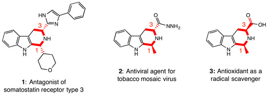 A 2,3,4,9-tetrahydro-9H-pyrido[3,4-b]indole skeleton—known as tryptoline or tetrahydro-β-carboline—represents a large group of natural and synthetic alkaloids. Recently, tryptoline derivatives have attracted attention because of their anti-HIV, anti-inflammatory, anti-leishmanial, anti-trypanosomal, and anti-tumor activities [1,2,3,4]. Among these derivatives, 1,3-disubstituted tryptoline derivatives have attracted attention because of the relation between their stereochemistry and biological activities based on their asymmetric carbons. The known examples of such 1,3-disubstituted derivatives of tryptoline shown in Figure 1 are an antagonist of somatostatin receptor type 3 (1) [5], an antiviral agent for tobacco mosaic virus (2) [6], and an antioxidant as a radical scavenger (3) [7].