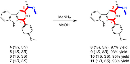 Tryptoline methyl ester derivatives 4–7 as the starting materials were synthesized according to a previously reported method [11,12]. The synthesized derivatives 4–7 were dissolved in methanol, followed by the addition of an ethanolic solution of methylamine. Next, the reaction mixture was stirred in an autoclave reactor at 50 °C for 48 h. During this reaction, no pressure increase was observed. The reaction mixture was concentrated in vacuo, followed by the purification of the obtained residue by silica-gel column chromatography and recrystallization from hot ethanol to afford amide compounds 8–11 in high yields of 93–98% (Figure 2). The absolute and relative configuration of obtained amide derivatives 8–11 has been defined on the basis of ¹H coupling constants (JH3-H4a and JH3-H4b) of NMR and correlation with ester derivatives 4–7 as starting material. The coupling constants (JH3-H4a = 5.0 Hz and JH3-H4b = 10.0 Hz) of the amide derivatives 8 and 10 agreed with that (JH3-H4a = 4.1 Hz and JH3-H4b = 11.1 Hz) of the ester derivatives 4 and 6 with the cis relative configuration [11,12]. These results indicate that the derivatives 8 and 10 have a cis relative configuration. The coupling constants (JH3-H4a = JH3-H4b = 4.5 Hz) of the amide derivatives 9 and 11 agreed with that (JH3-H4a = 4.5 Hz and JH3-H4b = 6.0 Hz) of the ester derivatives 5 and 7 with the trans relative configuration [11,12]. These results indicate that the derivatives 9 and 11 have a trans relative configuration. Given these results, the direct amidation reaction of tryptoline methyl ester derivatives does not affect the stereochemistry.
