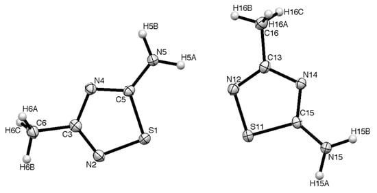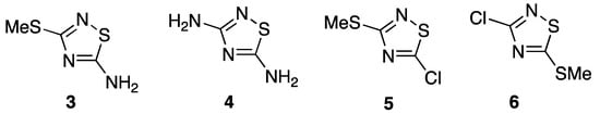 In view of the conflicting data for 1 just discussed, we thought it wise to confirm the structure of the compound unambiguously by X-ray diffraction. The crystals obtained directly from Soxhlet extraction proved to be suitable without further purification and the resulting structure is shown in Figure 1. There are two distinct but very similar molecules in the unit cell and the bond lengths and angles within each are in good agreement with those for previously studied simple 1,2,4-thiadiazoles such as 3 [], 4 [], 5 and 6 [] (Figure 2). In particular, the sulfur atom has long bonds to both C and N and an internal angle of almost 90° which is compensated for by a wide angle of 120° at the methyl-bearing carbon while the remaining internal ring angles are near to the 108° expected for a regular pentagon.