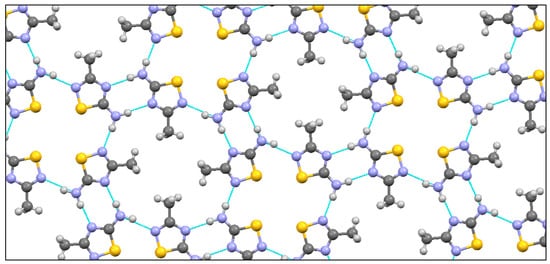 As might be expected, the crystal structure is dominated by hydrogen bonding with each NH2 group forming hydrogen bonds with both N-2 and N-4 of adjacent molecules (Table 1). The result is a two-dimensional network featuring pairs of molecules bonded by head-to-tail NH to N-4 interactions, as well as 20-membered rings with four sulfur atoms pointing inward formed using only the NH to N-2 interaction, and 24-membered rings with four methyl groups pointing into the middle involving both NH to N-2 and NH to N-4 interactions (Figure 3).