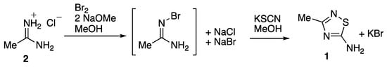 The original synthetic route to 1 (Scheme 1) starts from the readily available [] acetamidine hydrochloride 2 and involves simultaneous addition of bromine and sodium methoxide in methanol to generate the N-bromoacetamidine. This is not isolated but reacts directly with added potassium thiocyanate to give the final product 1 []. The isolation procedure consists of filtering the reaction mixture to remove most of the inorganic salts, evaporation of the filtrate and recrystallisation of the residue from water []. In our hands, this procedure was not satisfactory, giving a variable low yield of a solid still containing metal halides. Extraction of the solid with isopropanol was also unsuccessful. Much better results were achieved by subjecting the solid from evaporation of the reaction filtrate to thorough Soxhlet extraction using dichloromethane. This gave a pure product free of inorganic salts in comparable yield to the original report.