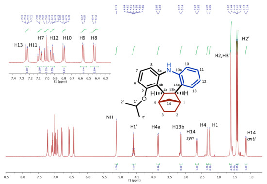 Compound 3 was characterized by NMR (1H and 13C-NMR in Figure 1 and Figure 2), FT-IR, and MS. In addition, all proton and carbon signals were assigned by 2D and 13C-DEPT-NMR experiments (Figures S1–S11, Supplementary Materials) and protons on the norbornene bridge were unequivocally assigned by NOESY-2D-NMR (Figure S12, Supplementary Materials). As expected, diagnostic NOE correlations appear between H13 and H13b (green circle, Figure S12), and H1′ and H6 (blue circle, Figure S12). Furthermore, the proton marked as H14 anti has a strong NOE correlation with H2/H3 protons (red circle in Figure S12), while no correlation signals are present between H2/H3/H4a/H13b protons and H14 syn. In summary, the signal at 1.62 ppm, which accounts for H2/H3 (both endo and exo) protons, presents typical NOE correlations with H4a, H13b (orange circle in Figure S12), H4, H1 (grey circle in Figure S12), and H14 anti (red circle in Figure S12), as expected for the presented stereochemistry.