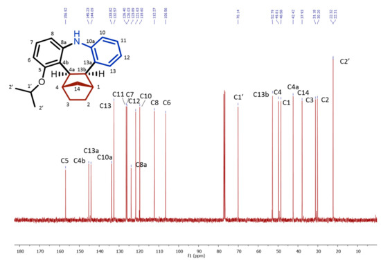 1H-NMR (400 MHz, CDCl3) δ 7.23 (dd, J = 7.7, 0.9 Hz, 1H, H13), 7.08 (td, J = 7.6, 1.5 Hz, 1H, H11), 7.00 (t, J = 8.0 Hz, 1H, H7), 6.93 (td, J = 7.4, 1.0 Hz, 1H, H12), 6.79 (dd, J = 7.7, 0.9 Hz, 1H, H10), 6.56 (d, J = 8.1 Hz, 1H, H6), 6.43 (d, J = 7.9 Hz, 1H, H8), 5.13 (s, 1H, NH), 4.59 (hept, J = 5.9 Hz, 1H, H1′), 3.84 (d, J = 9.7 Hz, 1H, H4a), 3.15 (d, J = 9.7 Hz, 1H, H13b), 2.66 (d, J = 9.6 Hz, 1H, H14 syn), 2.34 (s, 1H, H4), 2.26 (s, 1H, H1), 1.62 (s, 4H, H2 endo, H2 exo, H3 endo, H3 exo), 1.43 (d, J = 6.0 Hz, 3H, H2′), 1.40 (d, J = 6.0 Hz, 3H, H2′), 1.16 (d, J = 9.6 Hz, 1H, H14 anti). 13C-NMR (101 MHz, CDCl3) δ 156.92 (C5), 145.23 (C4b), 144.09 (C13a), 133.82 (C10a), 132.57 (C13), 126.40 (C11), 126.03 (C7), 123.89 (C8a), 121.63 (C12), 119.60 (C10), 112.27 (C8), 106.56 (C6), 70.14 (C1′), 52.79 (C13b), 49.81 (C4), 48.58 (C1), 42.42 (C4a), 37.93(C14), 31.18 (C3), 30.20 (C2), 22.32 (C2′), 22.31 (C2′). GC-MS (EI): m/z 319 (M+, 100), 276 (12), 252 (54), 238 (65), 210 (36), 196 (72), 180 (25), 167 (13). Anal. Calcd. for C22H25NO: C, 82.72; H, 7.89; N, 4.38. Found: C, 82.49; H, 7.78; N, 4.31.
