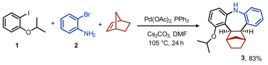 As shown in Scheme 1, cis,exo-1,2,3,4,4a,13b-hexahydro-1,4-methano-5-isopropoxy-9H-tribenzo [b,f]azepine (3) was synthesized in 83% isolated yield. The reaction was carried out using 1-iodo-2-isopropoxybenzene (1), o-bromoaniline (2), and norbornene, in the presence of a catalytic amount of Pd(OAc)2 (5 mol %), PPh3 (12.5 mol %), and Cs2CO3 as a base in DMF at 105 °C for 24 h. Notably, the isopropoxy group, which can be easily converted to a hydroxyl group [26], is well tolerated by this protocol.