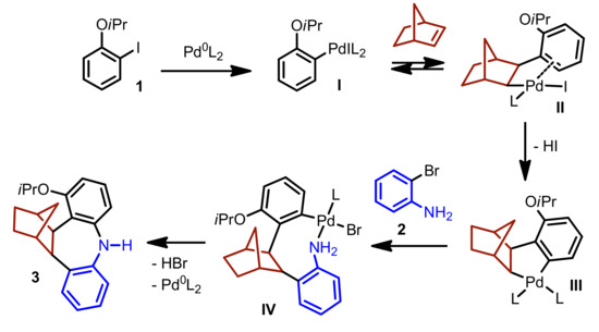 A plausible reaction mechanism is shown in Scheme 2. At first, the oxidative addition of 1 to palladium(0) affords the palladium(II) complex I, which, after stereoselective norbornene insertion, leads to intermediate II. The intramolecular C-H bond activation provides the arylnorbornyl palladacycle III, which is able to react with 2-bromoaniline 2, giving intermediate IV. Finally, an intramolecular C-N coupling affords compound 3 and palladium(0), which can start a new catalytic cycle. Contrary to many other Catellani-type reactions, norbornene is a reagent here since it is incorporated in the final product.