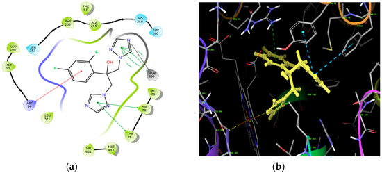 (a) 2D and (b) 3D docking pose of the standard drug fluconazole with MTCYP51.