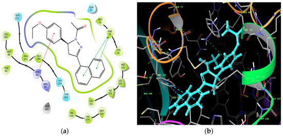 The 1H-NMR spectrum of the compound displayed characteristic system of AMX pattern due to the pyrazoline moiety. The two diastereotopic methylene protons HA and HM at position 4 of the pyrazoline ring displayed two doublet of doublets at 3.36 ppm (JAM = 17.6 Hz, JAX = 4.4 Hz) and 3.96 ppm (JMA = 8.4 Hz, JMX = 2.5 Hz) respectively, whereas the methine proton HX at position 5 of the ring showed doublet of doublets at 5.73 ppm (JXA =11.6 Hz, JXM = 4.4 Hz). The protons of the acetyl –CH3 resonated as a singlet at 2.50 ppm, whereas the methyl and the methylene protons of the ethoxy substituent displayed peaks at 1.39 ppm and 3.98 ppm respectively, the former resonating as a triplet and the latter as a quartet. The eleven aromatic protons appeared as a multiplet in the region 6.83–7.92 ppm.