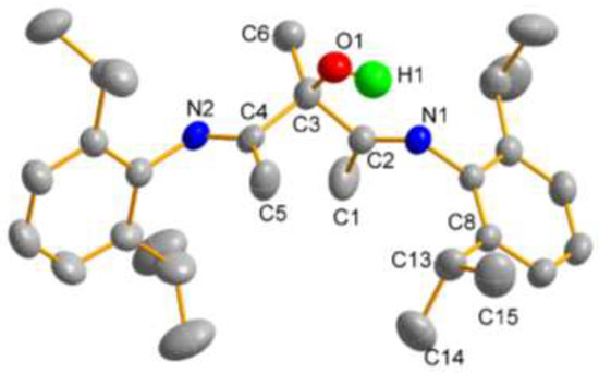 Previously, the selective reductive addition of the α-imino ketones with the organoaluminium regents has been reported [11,12,13]. As a result, trimethylaluminum (TMA) was chosen as a reducing agent to obtain the desired product. As shown in Scheme 2, treating 2,4-bis(2,6-diisopropylphenylimino)pentan-3-one with 1.3 or 3 equiv of AlMe3 at the reflux temperature for 10 h created the aluminum complex in situ, before the reaction mixture was carefully hydrolyzed with an aqueous NaOH solution. According to the reported complex VI (Scheme 1) [8], the intermediate aluminum salt is deemed to be N,O-bound with a tetrahedral arrangement (Scheme 2). The desired product was obtained in high yields of up to 79.3%. To our surprise, the selective reduction of C=O double bonds still occurs even in the presence of an excess proportion of AlMe3. This was the first reported compound, which was fully characterized by 1H, 13C-NMR spectroscopy and 1H-13C HSQC spectroscopy, mass spectrometry (Figures S1–S4), elemental analysis and X-ray crystallography (Table S1). In CDCl3, the characteristic peak in the 1H-NMR for the products is at approximately δ = 6.27 ppm, which corresponds to the proton of the hydroxyl group. The chemical shift at 80.63 ppm in the 13C-NMR represents the signals for the C-OH of the compound. The chemical shifts of other protons and carbons were further assigned by 1H, 13C-NMR spectroscopy and the 1H-13C HSQC spectroscopy (see Materials and Methods).