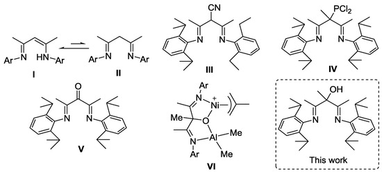 β-Diketiminates (Scheme 1, I) or β-diimines (the tautomers of β-diketiminates, Scheme 1, II) are well known as the spectator ligands to stabilize metallic complexes. The steric and electronic properties of β-diketiminates or β-diimines can be easily modified with the appropriate substituents. Thus, these ligands have been widely applied in the metal-catalyzed organic reactions and polymerizations [1,2,3,4]. However, the synthesis of β-diimines with a functional group at the α-site remains scarce (Scheme 1, III–V) [5,6,7,8]. One notable example is that the introduction of the carbonyl functionality at the α-site (α-keto-β-diimine, Scheme 1, V) enables an improvement in the control of nickel-catalyzed polymerization [8]. Furthermore, the reaction of the α-keto-β-diimine nickel complex with trimethylaluminum (TMA) results in the formation of binuclear organometallic species (Scheme 1, VI) [9]. On the basis of these works, we decided to synthesize the α-hydroxyl-β-diimine by the reduction of the C=O double bond of α-keto-β-diimine. Since the reduction of C=N double bonds may also occur in this reaction, selective reduction of only the C=O double bond is the main difficulty that we had to consider [10]. In this contribution, the first available preparation and characterization of 2,4-bis[(2,6-diisopropylphenyl)imino]-3-methylpentan-3-ol were described.