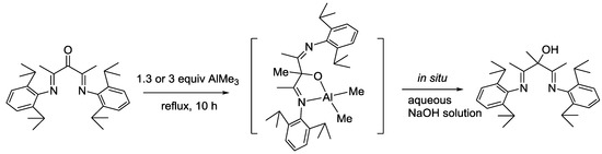 The compound 2,4-bis[(2,6-diisopropylphenyl)imino]-3-methylpentan-3-ol was synthesized with a yield of approximately 80% by the reaction of 2,4-bis(2,6-diisopropylphenylimino)pentan-3-one with trimethylaluminum, which was followed by hydrolysis with an aqueous NaOH solution. A chemoselective addition to the C=O bond occurred in this reaction. The structure was confirmed by X-ray crystallography. This new compound was also fully characterized by 1H, 13C-NMR spectroscopy and 1H-13C HSQC spectroscopy, mass spectrometry and elemental analysis.