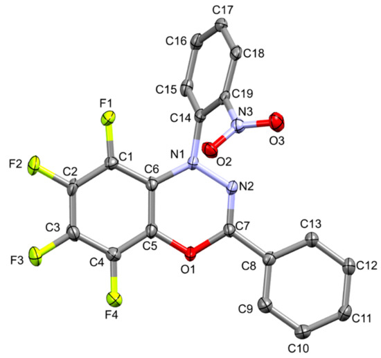 5,6,7,8-Tetrafluoro-1-(2-nitrophenyl)-3-phenyl-1H-benzo[e][1,3,4]oxadiazine (5) crystallized in the centrosymmetric P-1 triclinic space group. The 1,3,4-oxadiazine moiety was in a shallow boat geometry, where N1 and O1 (crystallographic numbering) deviated from the plane by 18.4° and 16.4°, respectively. The N-(2-nitrophenyl) substituent twisted out of the benzoxadiazine plane by 70.3°, while the phenyl at C7 (crystallographic numbering) remained in the benzoxadiazine plane.