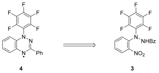 Structure of 1-(perfluorophenyl)-3-phenyl-1,2,4-benzotriazin-4-yl (4) and its precursor N′-(2-nitrophenyl)-N′-(perfluorophenyl)benzohydrazide (3).