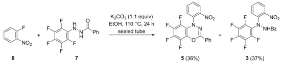 Treating 1-fluoro-2-nitrobenzene (6) with N′-(perfluorophenyl)benzohydrazide (7) and potassium carbonate (1.1 equiv) in EtOH heated to 110 °C (sealed tube) for 24 h gave 5,6,7,8-tetrafluoro-1-(2-nitrophenyl)-3-phenyl-1H-benzo[e][1,3,4]oxadiazine (5) [Rf 0.72 (n-hexane/DCM, 50:50)] and N′-(2-nitrophenyl)-N′-(perfluorophenyl)benzohydrazide (3) [Rf 0.57 (n-hexane/t-BuOMe, 50:50)], in 36 and 37% yields, respectively (Scheme 3).