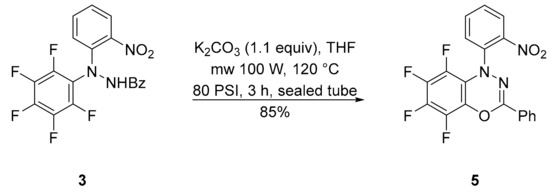 Conversion of N′-(2-nitrophenyl)-N′-(perfluorophenyl)benzohydrazide (3) into 5,6,7,8-tetrafluoro-1-(2-nitrophenyl)-3-phenyl-1H-benzo[e][1,3,4]oxadiazine (5).