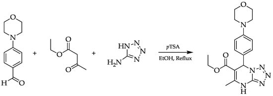 A Biginelli reaction is a multicomponent reaction that is known for its versatility by changing its reaction components to furnish various DHPM derivatives. In this article, we report the synthesis of tetrazolo[1,5-a]pyrimidine by replacing urea with 5-aminotetrazole and benzaldehyde with 4-morpholinobenzaldehyde using p-toluenesulfonic acid (pTSA) as a catalyst in ethanol under reflux. The target compound was obtained as a purple needle crystal in a 58% yield. The molecular structure of the product was established by spectroscopic evidence, using FTIR, HRESI-MS, and 1H- and 13C-NMR. The reaction process is described below (Figure 1).