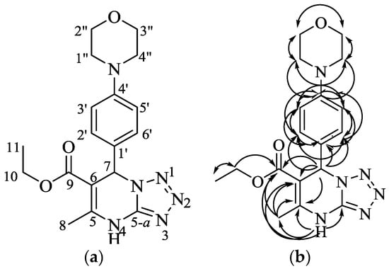 The existence of the dihydrotetrazolopyrimidine was established by a HMBC experiment, which showed a correlation of a proton at C-7 with an olefinic carbon atom (δC 145.8 (C-5); 99.6 (C-6)) and a carbonyl ester group (δC 165.1 (C-9)). In addition, four correlations of a proton attached at a nitrogen atom with an olefinic carbon (δC 145.8 (C-5) and 99.6 (C-6)), a carbonyl ester (δC 165.1, C-9), and an aminotetrazolo-type carbon atom (δC 148.8 (C-5a)) were observed. The presence of an aryl substituent attached at C-7 was proved by a long-range correlation of the C-7 proton with three aromatic carbons (δC 131.1 (C-1′) and 128.4 (C2′; C-6′)). Moreover, the position of the methyl group at C-8 was proved by a proton long-range correlation with the olefinic carbon atom (δC 145.8 (C-5) and 99.6 (C-6)) and carbonyl ester group (δC 165.1 (C-9)). The proton–carbon correlations from the HMBC experiment (Supplementary Materials, Figure S6) corresponded with the prepared compound and are presented in Figure 2. On the basis of the spectroscopic evidence, the prepared compound is a new compound that has never been published previously.