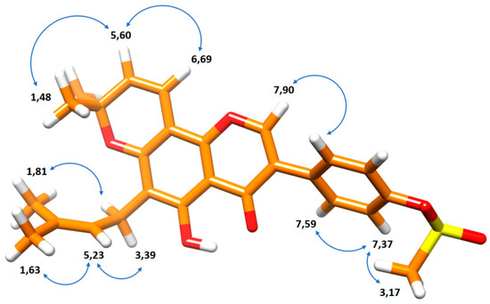 Minimized three-dimensional (3D) structure of compound 2 (force field: MMFF94). Chemical shifts are reported close to the corresponding nuclei and the observed nuclear Overhauser effect spectroscopy (NOESY) correlations are represented as blue arrows.