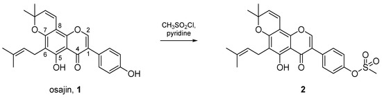 A solution of CH3SO2Cl (0.53 mL, 6.88 mmol, 14 eq.) in 3 mL of pyridine was added to a solution of osajin (1, 200 mg, 0.49 mmol, 1 eq.) in 2 mL of pyridine under stirring. The mixture was stirred overnight at room temperature (r.t.) until the reaction was concluded (TLC hexane/ethyl acetate 3:1). Subsequently, it was poured in an equal volume of ice-cold water and the formed precipitate was filtered and washed with water. The product was recrystallized from EtOH (112 mg, 46%). δH (400 MHz, CDCl3) 1.48 (6H, s, Me), 1.68 (3H, s, Me), 1.81 (3H, s, Me), 3.17 (3H, s, -SO2CH3), 3.35 (2H, d, J = 7.3 Hz, CH2), 5.23 (1H, t, J = 7.3 Hz, C=CH), 5.60 (1H, d, J = 10.1 Hz, C=CH), 6.69 (1H, d, J = 10.1 Hz, C=CH), 7.37 (2H, AA′BB′, J = 8.1 Hz, PhH), 7.59 (2H, AA′BB′, J = 8.1 Hz, PhH), 7.90 (1H, s, C=CH), 13.14 (1H, s, OH). δC (100 MHz, CDCl3) 17.9, 21.3, 25.8, 28.2, 37.4, 78.0, 100.9, 105.5, 113.2, 114.8, 121.8, 122.2, 122.5, 127.4, 130.5, 130.6, 131.7, 149.2, 150,4, 152.9, 157.5, 159.3, 180.4. HMRS (ESI) found 483.1693 (C26H26O7S, [M + H]+), calc. 483.1479.