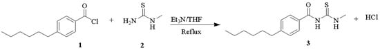 The scheme of reaction between 4-hexyl benzoyl chloride with N-methylthiourea.