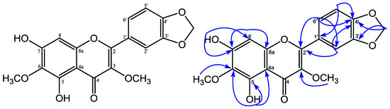 Structure and selected HMBC correlations for 5,7-dihydroxy-3,6-dimethoxy-3′,4′-methylenedioxyflavone.