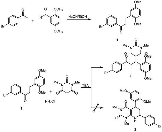 In continuing of our research, we intended to synthesize a 5,7-diphenyl-5,8-dihydropyrido [2,3-d]pyrimidine-2,4(1H,3H)-dione (3) derivative through a Hantzsch cyclocondensation-type reaction constructed from a chalcone derivative (serving as the C–C–C unit) and 1,3-dimethylbarbituric acid (serving as the dioxopyrimidine unit) in the presence of ammonium chloride using triethylamine (TEA) acting as a Lewis base catalyst. Unfortunately, based on the spectroscopic evidence, the reaction stopped at the Michael addition process and did not proceed further to cyclocondensation. In this paper, we describe the synthesis and the characterization of the title compound.