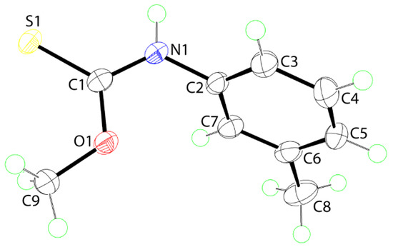 The title compound, 1, was prepared from the facile and stoichiometric reaction of m-tolyl isothiocyanate and NaOH conducted in methanol solution. Compound 1 is low-melting point solid that was characterised by IR, NMR, and UV spectroscopy (see Supplementary Materials for original spectra). Crystals of 1 formed in the mother liquor when kept in a refrigerator, that is, at ca. 4 °C. The isolated crystals melted almost immediately upon removal from the mother liquor under ambient conditions. This behaviour contrasts a previous literature report, where a melting point of 43 °C was reported [4]. In the present study, crystals were analysed immediately before they began to melt. This behaviour precluded the recording of a melting point and the determination of microanalytical data. In the IR, the expected bands due to ν(N-H) (3182 (br)), ν(C-N) (1444 (vs)), ν(C = S) (1203 (vs)), and ν(C-O) (1090 (m)) were observed. The 1H and 13C{1H} NMR data showed the expected resonances and integration (1H). The quaternary carbon-C1 atom exhibited a 13C{1H} resonance at δ 189.6. A single band at ca. 275 nm was observed in the UV spectrum which is ascribed to a π-π* transition [8].