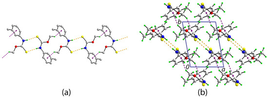 The molecular packing in the crystal of 1: (a) a view of the supramolecular chain sustained by N-H…S hydrogen bonds and methoxy-C-H…π(m-tolyl) interactions shown as orange and purple dashed lines, respectively. Non-participating hydrogen atoms have been omitted. (b) A view of the unit cell contents in projection down the c-axis. Selected geometric parameters for the specified intermolecular interactions: N1-H1n…S1i = 2.52(2) Å, N1…S1i = 3.3757(18) Å with angle at H1n = 169.5(17)°. C9-H9a…Cg(C2-C7)ii = 2.80 Å, C9…Cg(C2-C7)ii = 3.4892(19) Å with angle at H9a = 128°. Symmetry operations: (i) 1-x, 1-y, 1-z and (ii) 2-x, -y, 1-z.
